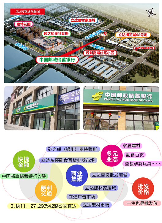 立達(dá)博覽城位于銀川市友愛(ài)新商圈核心位置,項(xiàng)目東至燕慶路,西至麗景南街,南至規(guī)劃路,北至治平路,緊鄰銀川環(huán)城高速、京藏高速及銀古物流中心,地理位置優(yōu)越、交通路網(wǎng)便捷高效。項(xiàng)目總占地1000畝,囊括立達(dá)建材家居城、立達(dá)東環(huán)副食品批發(fā)市場(chǎng)、立達(dá)百貨批發(fā)商城、立達(dá)廣告市場(chǎng)、立達(dá)型材市場(chǎng)、砂之船奧特萊斯(建設(shè)中)奧萊花苑(精品住宅項(xiàng)目,火熱預(yù)定中)。集展示、銷(xiāo)售、倉(cāng)儲(chǔ)、物流、商業(yè)配套、住宅為一體。商業(yè)涵蓋建材、家居、副食、百貨日雜、童裝 、孕嬰玩具、調(diào)料調(diào)味、酒水 、飲料、 糖果、 一次性用品、干果特產(chǎn)、茶葉、辦公文具等,品類齊全,實(shí)力商戶聚集,質(zhì)優(yōu)價(jià)廉,批零兼營(yíng)。