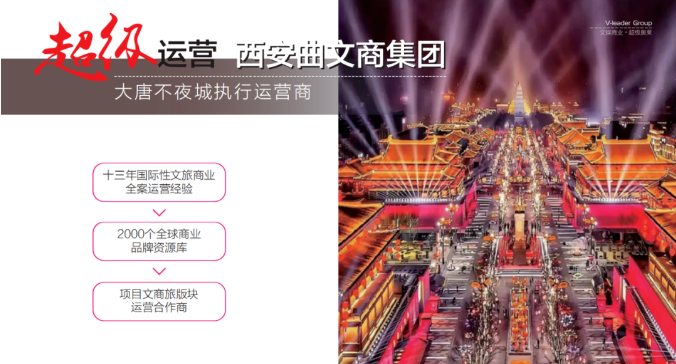 西安曲江文商商業(yè)運營管理有限公司(以下簡稱曲江文商商管)是一家專注于商業(yè)地產(chǎn)運營管理的公司,有著十三年豐富的全國文旅商業(yè)的運營經(jīng)驗,隸屬于西安曲江文化產(chǎn)業(yè)投資(集團)有限公司,業(yè)務(wù)覆蓋陜甘、河北、重慶、湖北和江浙地區(qū)。公司以“文創(chuàng)”、“文演”、“文游”、“文娛”、“文食”、“文旅”和“文玩”七大核心開創(chuàng)城市文旅生活,在文商綜合體領(lǐng)域具備獨特的競爭優(yōu)勢。從西安標志性文化旅游項目大唐不夜城大的執(zhí)行運營到芙蓉新天地文旅街的西安文旅城市新名片,曲江文商正以其超強的運營管理能力,助力一個又一個項目成功。