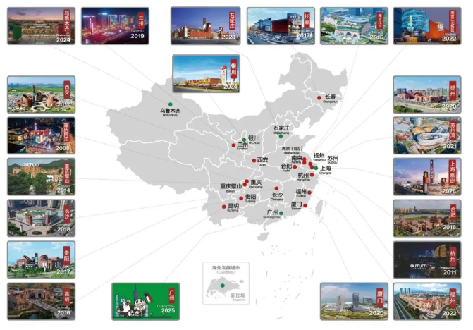 截止2024年,砂之船集團在重慶、杭州、南京、合肥、昆明、長春、西安、貴陽、長沙、蘭州、揚州、廈門、蘇州、福州、烏魯木齊等19個直轄市、省會城市或高速發(fā)展城市簽約落地21家大型超級奧萊,目前運營著17家超級奧萊。